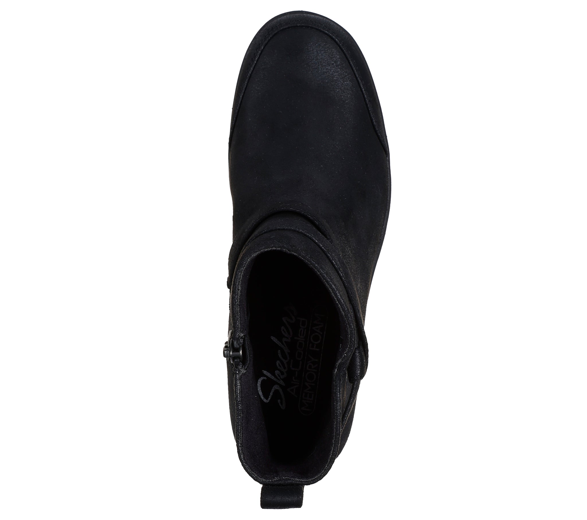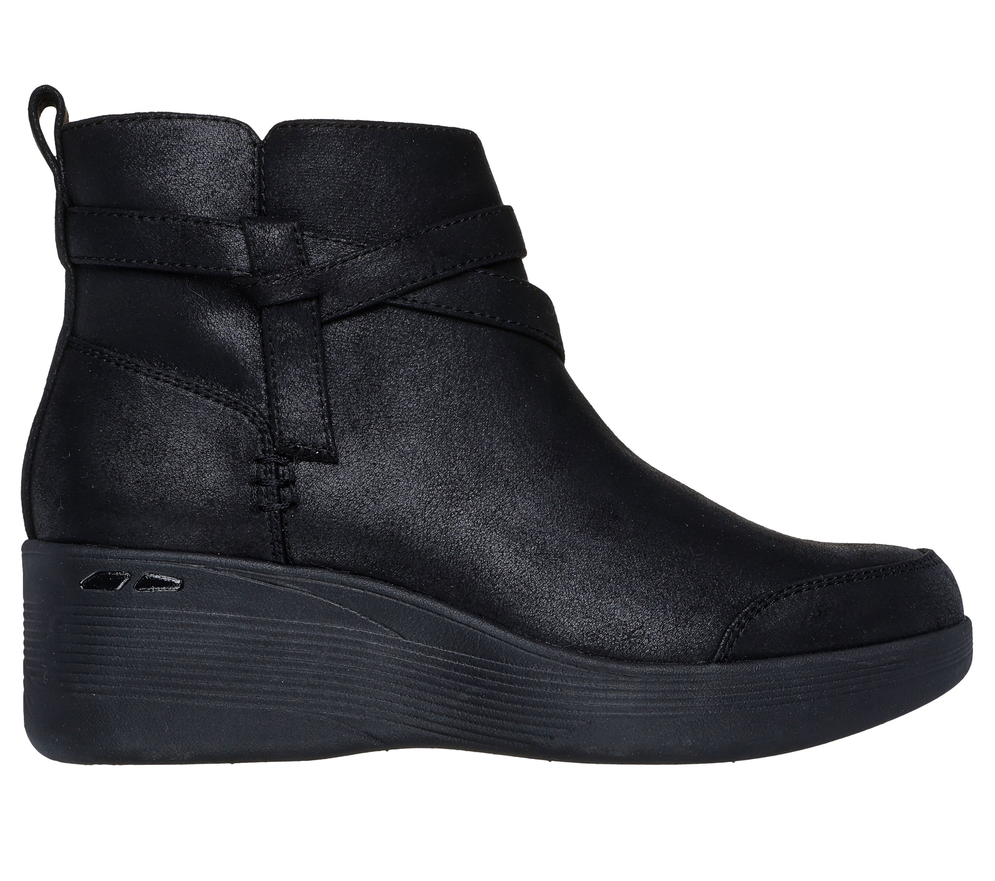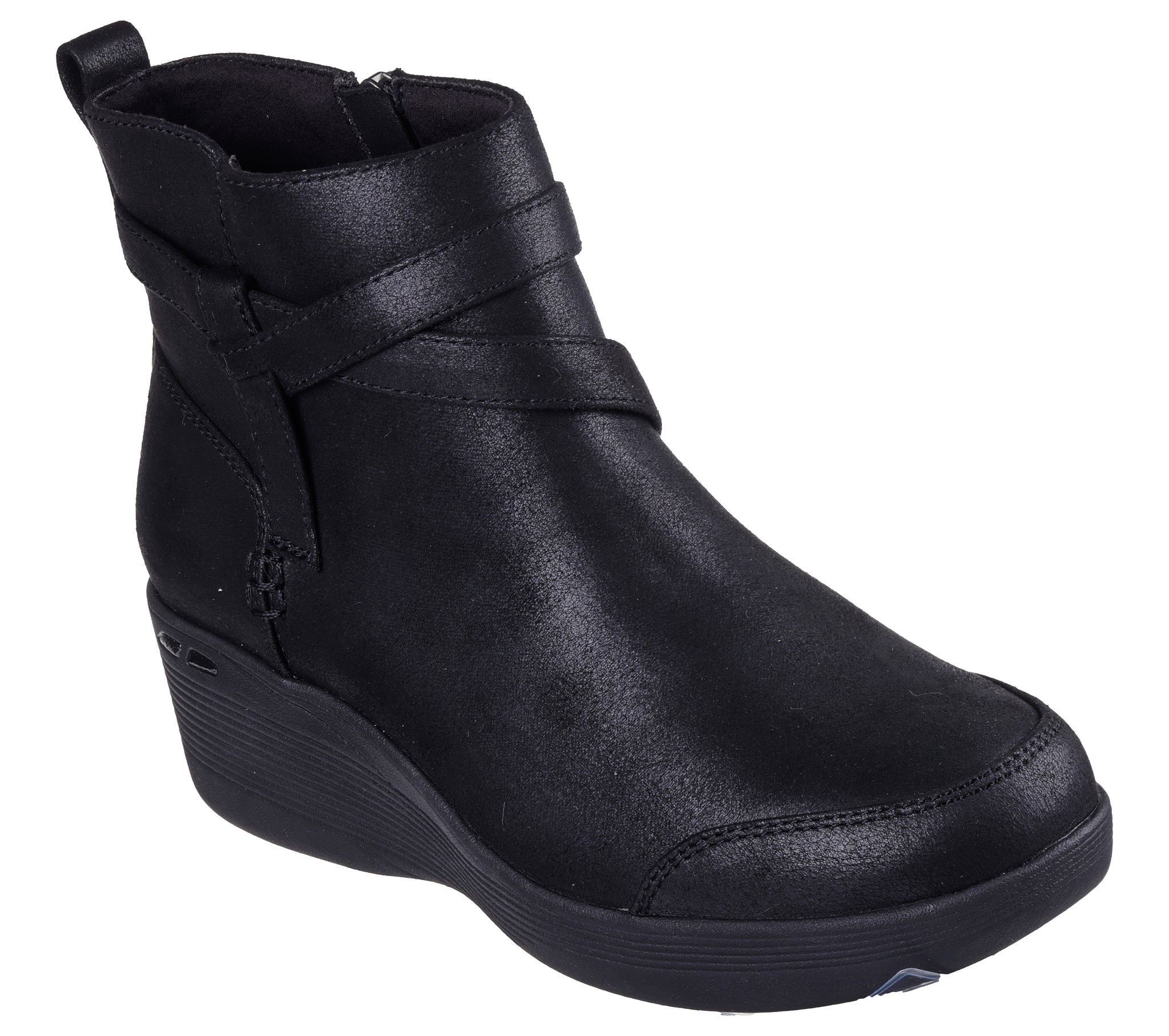 Enhance your style while enjoying lightweight comfort with the Skechers Pier-Lite - Everlasting. This vegan ankle boot with side zipper features a synthetic upper treated with 3M® Scotchgard®, a strap detail around the ankle, a Skechers Air-Cooled Memory Foam® insole, and a wedge heel.