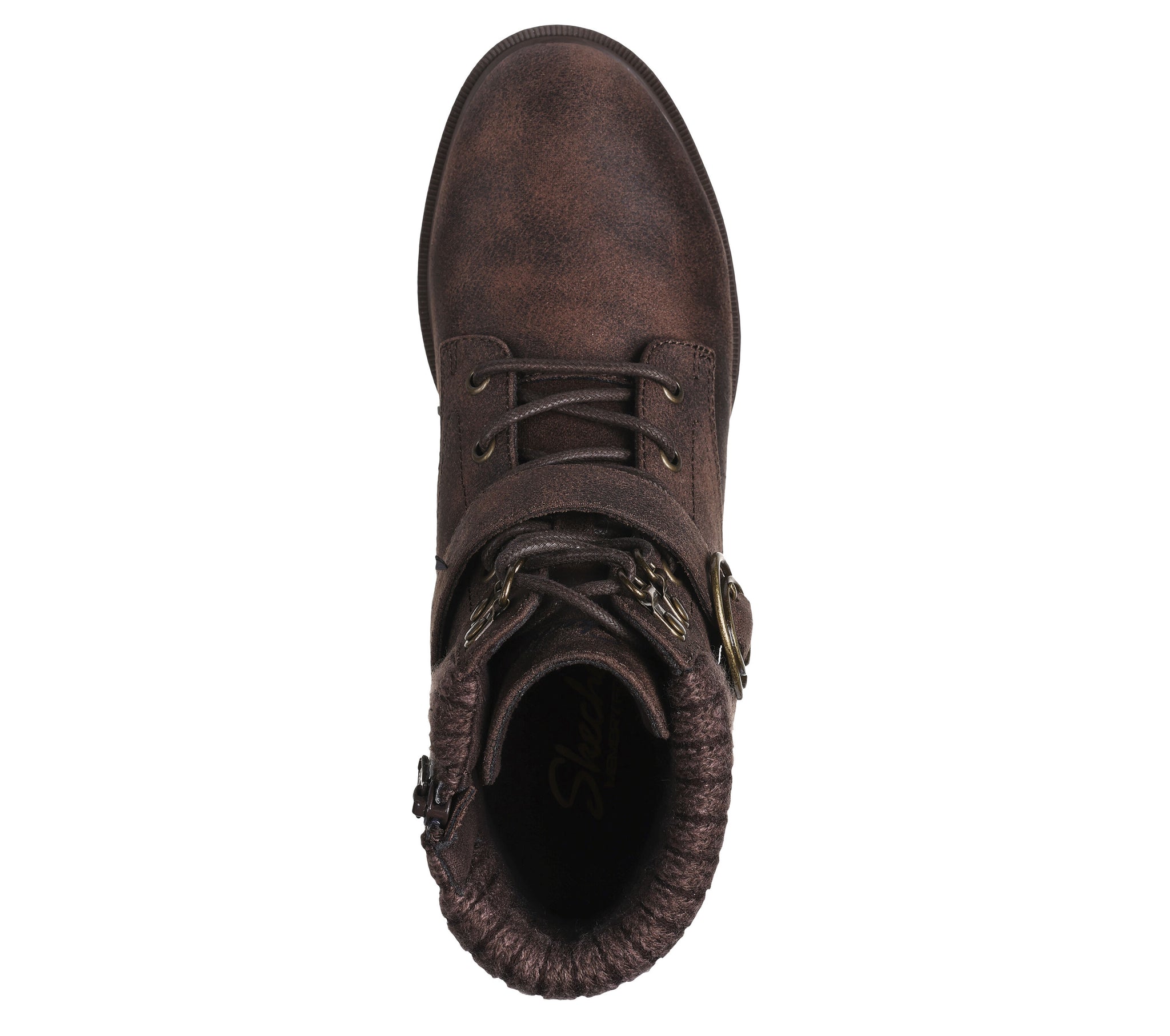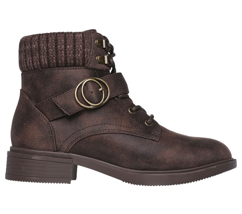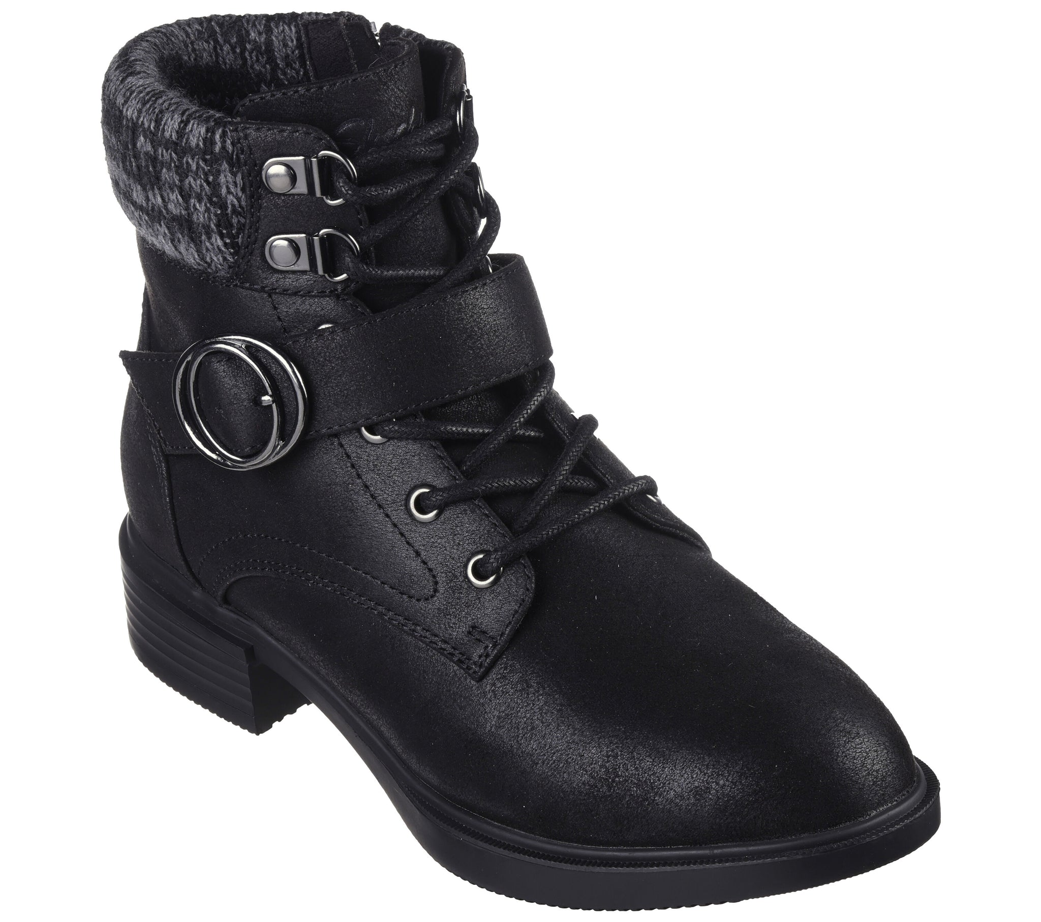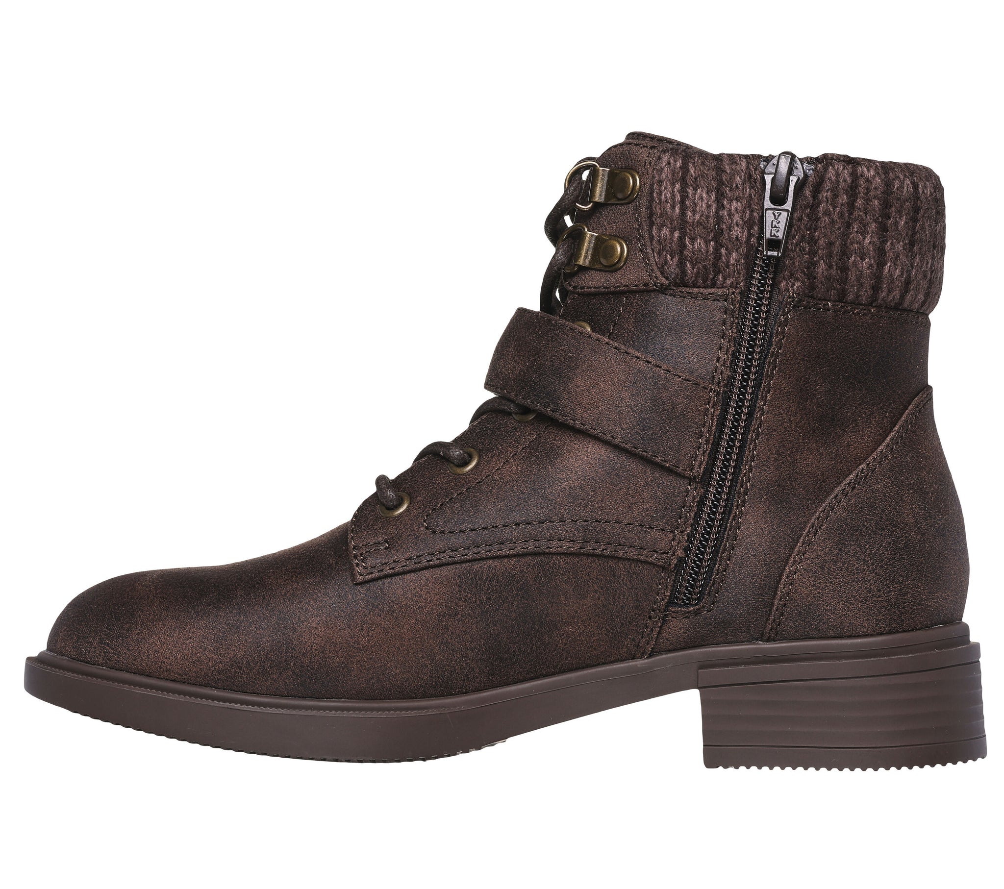 Style and cozy comfort combine in the Skechers Tenley - Dreaming Of Fall. Vegan leather lace-up upper with knit trim, buckle, side zipper and Skechers Air-Cooled Memory Foam® cushioned insole.